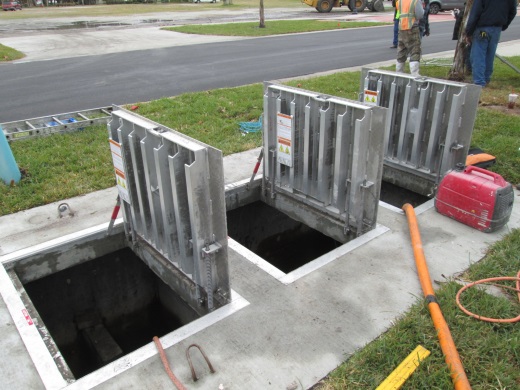 The construction of the project which also included streetscape with the drainage and the two baffle boxes started in June 2014 and completion of the project was in December 2014. The following photos show the installation of the nutrient baffle boxes during the construction.